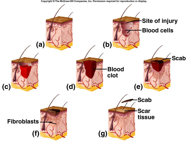 beneath the scab bridge the wound, fibroblasts develop scar